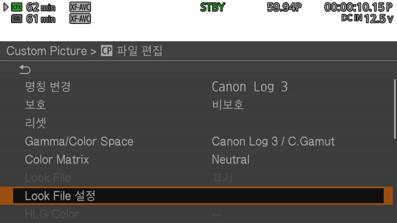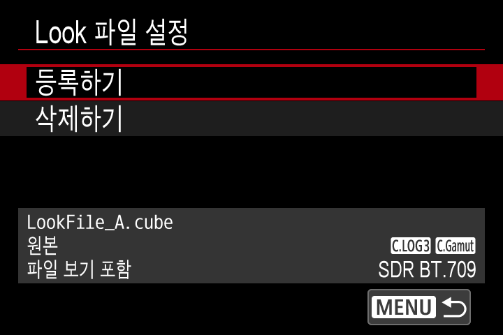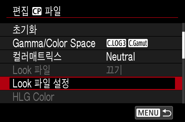 [Canon Log 3/C.Gamut]을 선택한 다음 [Look 파일 설정]을 선택합니다.*1