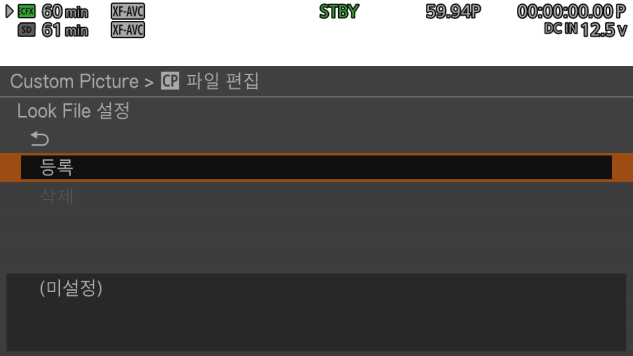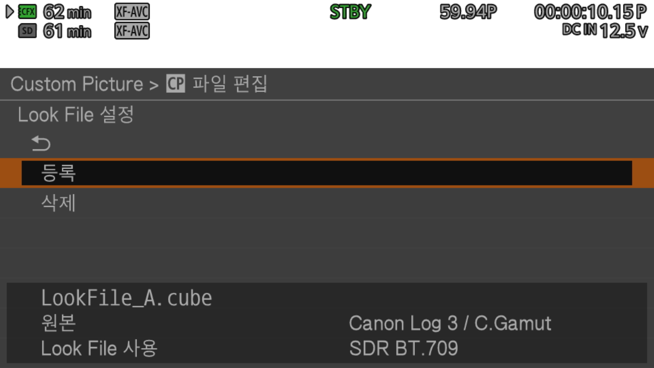 - 8. 등록한 LUT의 이름이 [Look 파일 설정] 창에 표시되는지 확인합니다.
