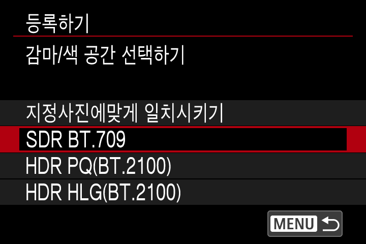 - 4. [Gamma/Color Space] 메뉴의 촬영 설정에 따라 [Canon Log 2/C.Gamut] 또는