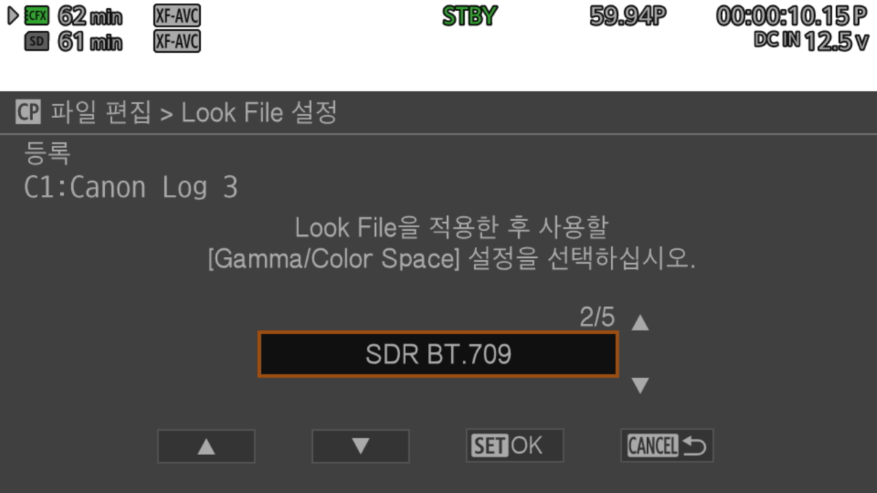 - * LUT에는 Canon Log 2 / Canon Log 3 → BT.709 Gamut으로 변환하는 LUT(Log to 709)과, Log 상태를 유지한 채 색 영역만 변경하는