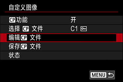 3.在 [自定义图像] 菜单的 [选择 CP 文件] 中选择一个 CP 文件 (C1-C20),然后选择 [编辑 CP 文件]。
