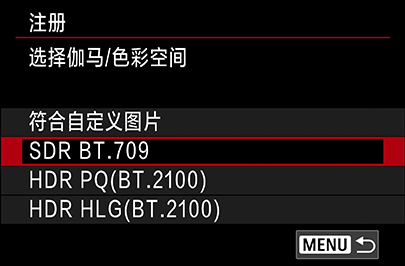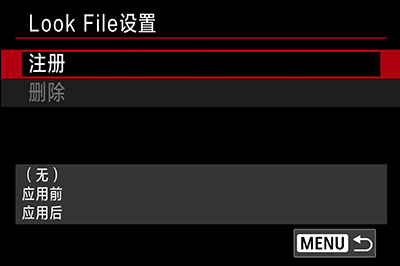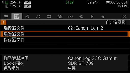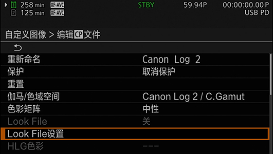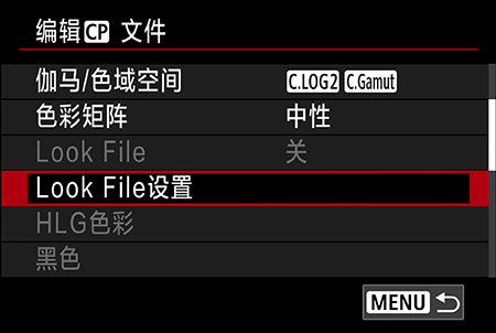 4.根据 [伽马/色域空间] 菜单中的拍摄设置,选择 [Canon Log 2/C.Gamut] 或 [Canon Log 3/C.Gamut],然后选择 [Look File 设置]。*1