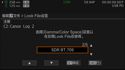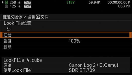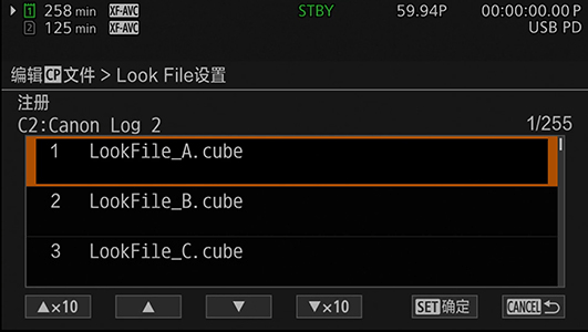 - *2 在部分摄影机型号中,即使存储卡上注册了超过 20 个 LUT,最多也仅能显示 20 个。